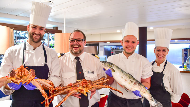 Det er slutt på pizza, øl og svette hamburgere om bord. I dag følger Hurtigrutens meny norskekystens tradisjoner, fra smalahove til klippfisk, trøndersodd og lutefisk. Alle råvarer er lokale, og blir servert med en historie – på norsk, tysk, engelsk og fransk. Godt, og lærerikt!
