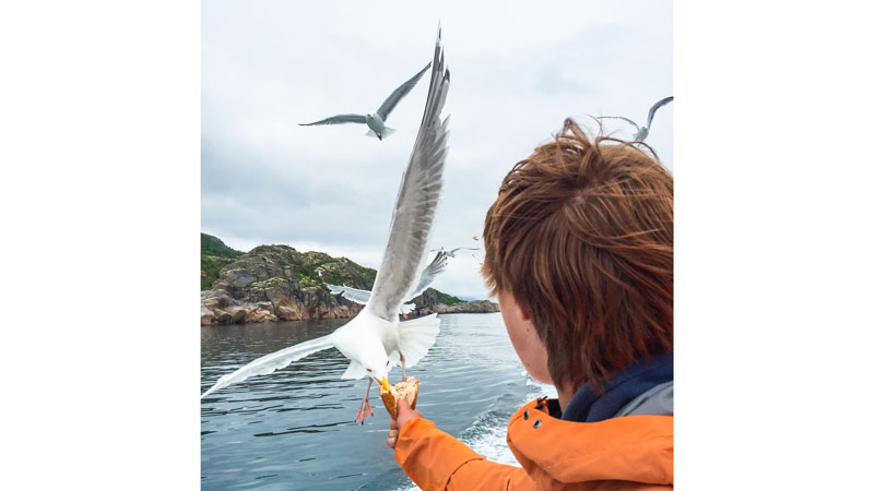 Det gjør også måkene. For mens båten putrer ut av sundet, får den et stadig større haleheng av hvite, gaukende fugler. Ikke rart – for langs rekka står Siv Myklebust og Asta Sigurdadottir og kaster godbiter til måkene. Hva skal vi med ørn, når vi har måker?