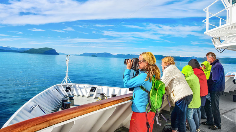 Båten svinger slakt, og passasjerer, ekspedisjonsledere og ansatte stimer foran på dekk, med kameraer og kikkerter klare.