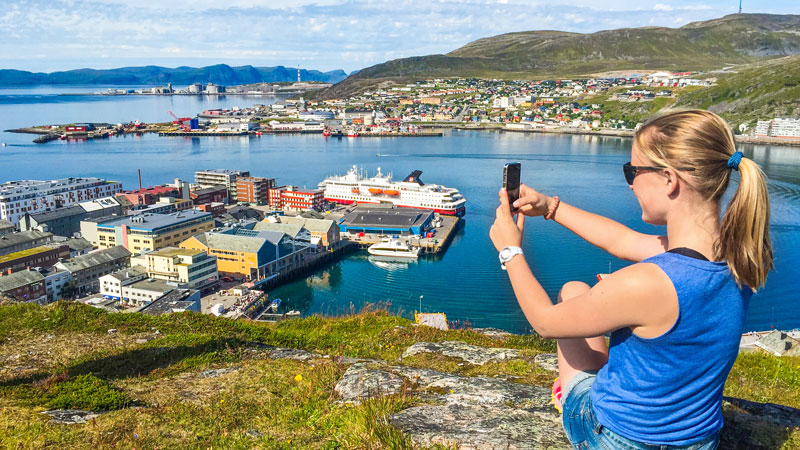 Hammerfest ligger på breddegrad med Sibir, så at utlendinger synes dette er eksotisk kan vi godt forstå. Men takket være Norges beliggenhet ved sjøen og Golfstrømmen, er klimaet en god del mer gjestmildt. I hvert fall i dag, hvor vi kan vandre i shorts og t-skjorte.